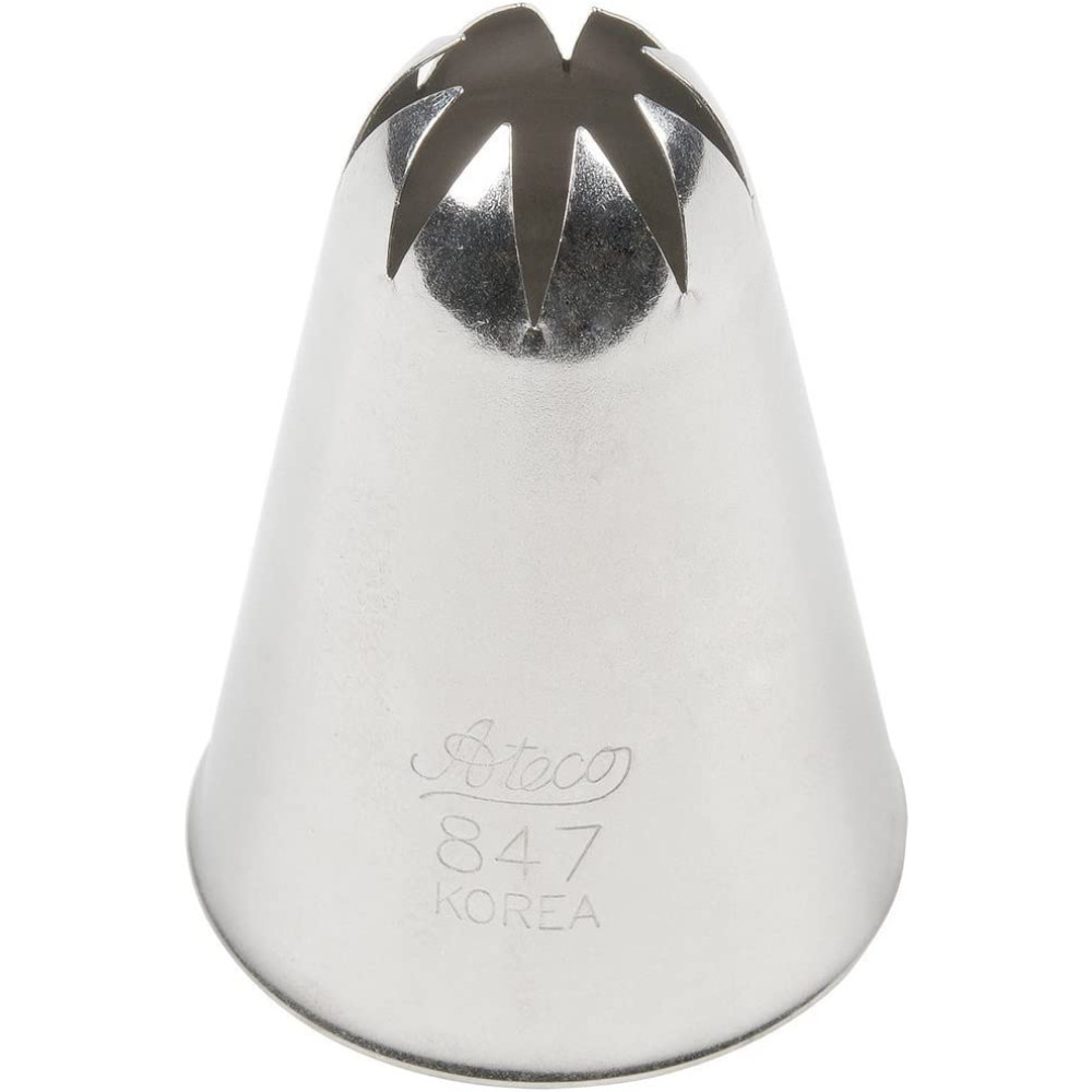 La boquilla Ateco 847 es una duya de repostería profesional tipo estrella cerrada (o estrella abierta grande según la fuente) fabricada en acero inoxidable duradero. Con un diámetro de base de aprox. 3.6 cm y altura de 5 cm, es ideal para crear bordes, estrellas, conchas, churros y decorar cupcakes o pasteles rápidamente.