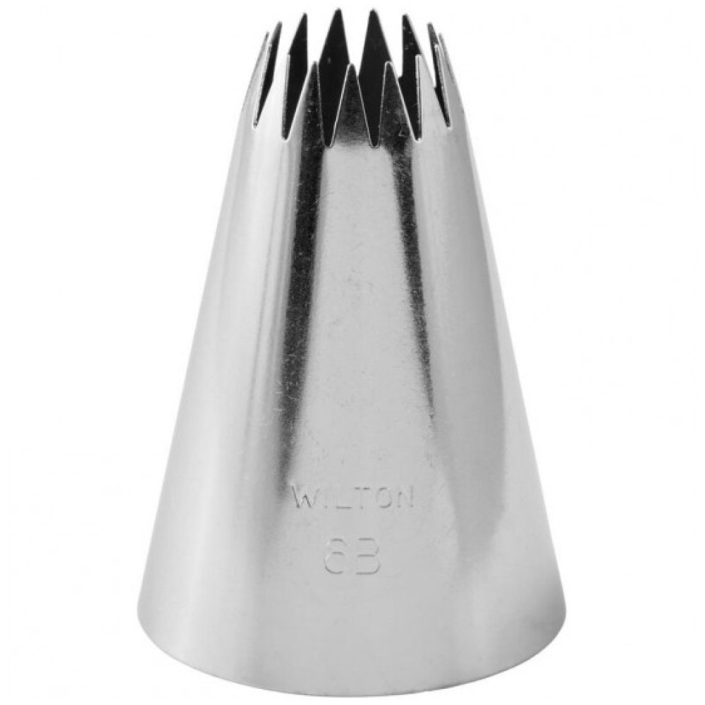La boquilla Wilton 6B es una punta de repostería de estrella abierta grande, fabricada en acero inoxidable duradero, ideal para crear estrellas definidas, bordes dentados, conchas y remolinos en pasteles y cupcakes. Con una abertura de aprox. 12 mm, es perfecta para decoraciones con mucha textura y fácil de usar.